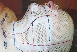Nun steht das Bestrahlungsfeld fest. Nach ca. 20 Minuten ruhigem Liegen und verschiedenen Markierungen sieht meine Maske nun so aus: